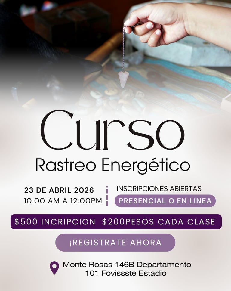 El curso de Rastreo Energético está enfocado en desarrollar la percepción y lectura consciente de la energía, aprendiendo a identificar bloqueos, movimientos energéticos y su relación con el bienestar emocional y físico.